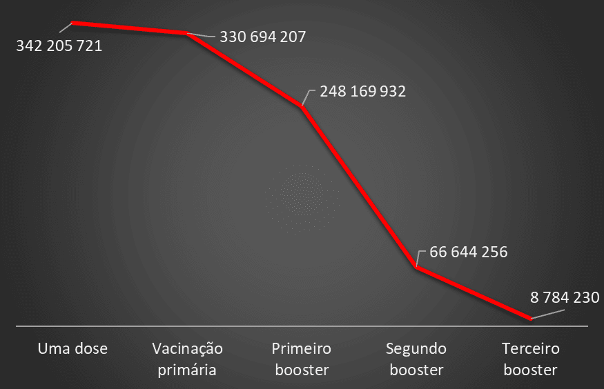 Em termos globais, a ECDC aponta assim para uma adesão de apenas 2,4% dos europeus aos terceiro booster, quando atingira 14,7% no segundo booster, os 54,6% no primeiro booster e os 73% na vacinação primária. Em termos absolutos, nos países europeus abrangidos pelo ECDC (União Europeia e ainda Islândia, Liechtenstein e Noruega), foram administradas mais de 330 milhões de doses em vacinação primária (houve cerca de 342 milhões de pessoas que optaram apenas por uma dose), baixando para 248 milhões quando as autoridades consideraram a necessidade de um reforço. Ao segundo reforço só responderam já um pouco menos de 67 milhões de pessoas. E para o terceiro booster já só mostraram interesse menos de 9 milhões de europeus. Assim, entre a vacinação primária e o terceiro reforço, contabiliza-se uma redução de 97,3%.