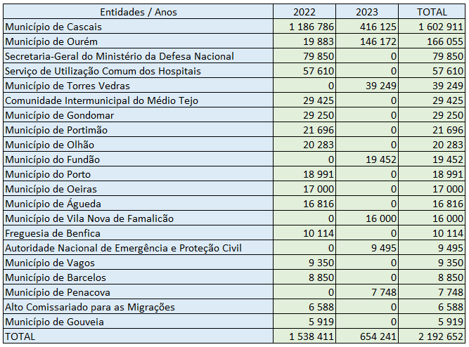 Para já, analisando no Portal Base todos os contratos públicos desde Março do ano passado para apoio aos refugiados ucranianos – e em alguns casos, em simultâneo, de apoio humanitário ao Afeganistão –, a autarquia de Cascais agrega 73% do total dos gastos contratualizados. Num total de 50 contratos de 21 entidades, entre as quais 16 autarquias, o município de Cascais assinou já 19, todos por ajuste directo, envolvendo um montante total de 1.602.911 euros, excluindo IVA. Uma parte substancial foi gasto no ano passado, mas este ano a factura está já acima dos 416 mil euros.
