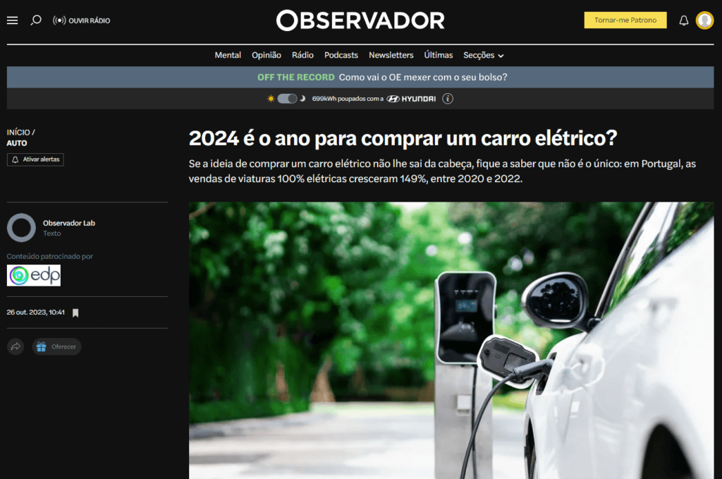 Aprestava-me para continuar a leitura, fazendo scroll sobre fotografia de um carro eléctrico a carregar (usei um computador), quando o meu olhar se desviou para a esquerda e leio o nome do ‘jornalista’: Observador Lab, com a indicação de “conteúdo patrocinado por EDP”. Com o logótipo da dita empresa.