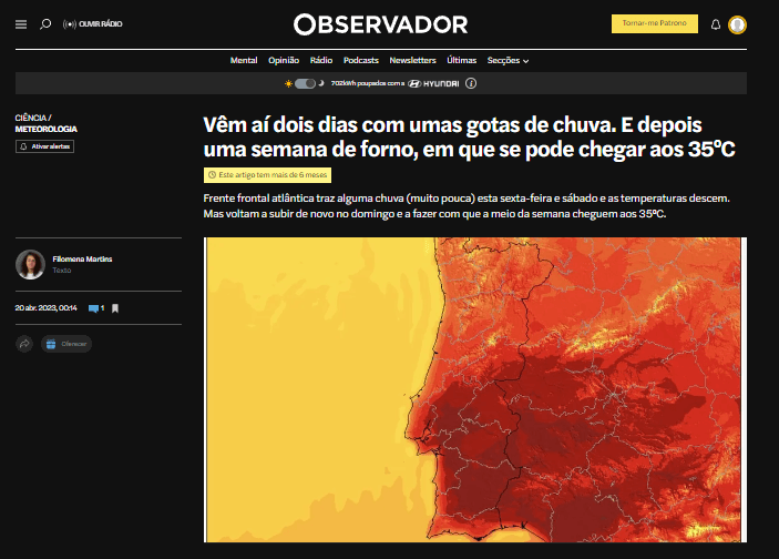 Nunca na minha vida (como técnico e como jornalista), em que me debrucei e li muito sobre eventos meteorológicos extremos, alguns com tendência crescente de frequência, tinha assistido, como no último ano, a títulos da imprensa como – e vou citar títulos da Filomena Martins – “rio atmosférico atravessa centro do país”, ou ainda “Portugal atingido por um comboio de tempestades”, ou ainda “Furacão Franklin+DANA espanhola = nova tempestade”, ou ainda “Oscar: vem aí uma tempestade rara para esta altura do ano. E pode trazer um “rio atmosférico” na quarta-feira”, ou ainda “Esta quarta foram batidos seis recordes de temperaturas de abril. Mas o pior chega amanhã”, ou ainda “Vêm aí dois dias com umas gotas de chuva. E depois uma semana de forno, em que se pode chegar aos 35ºC”, nestes casos sempre com mapas de amarelo para cima e nunca muito abaixo de vermelho, que melhor sempre se mostra meter encarnado em cima de vermelho.