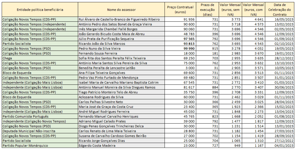 Apesar disso, o PÁGINA UM predispôs-se a fazer uma pesquisa detalhada, mas morosa, no Portal Base, desvendando alguns casos muito sui generis de aquisição de serviços de assessoria política em contratos em vigor a partir de 2023. Não estão, assim, incluídas as aquisições de serviços políticos celebradas no ano passado, e não se incluindo, deste modo, por exemplo os oito assessores contratados no início de 2022, e ainda em funções, para prestar assessoria a Rui Tavares, vereador sem pelouros do Livre e também deputado na Assembleia da República.