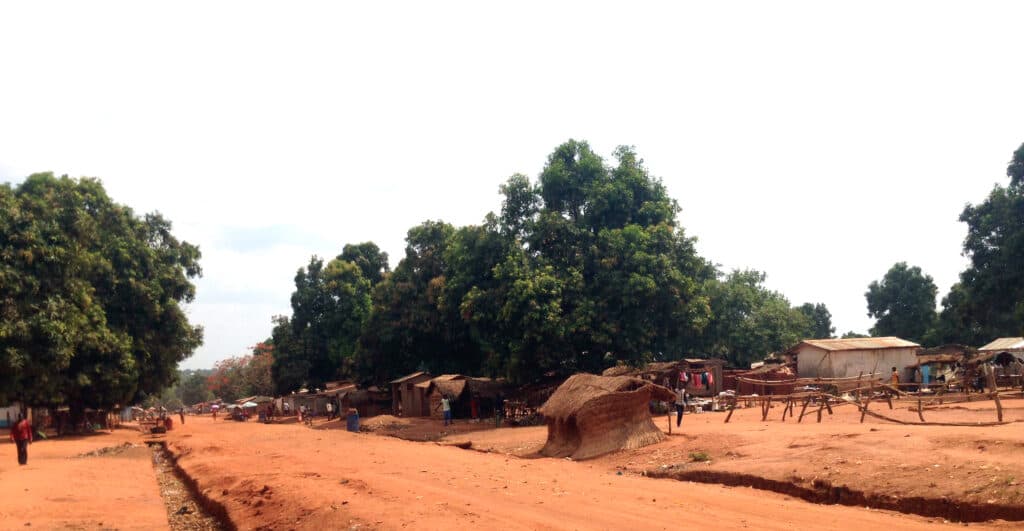 É dia de mercado e dia do Senhor. Entro no campo de deslocados PK 3. É o maior do país. Com as abominações da guerra mais de 90.000 cristãos e animistas procuraram refúgio neste monte desolado. Soa um sino. É a hora da missa.