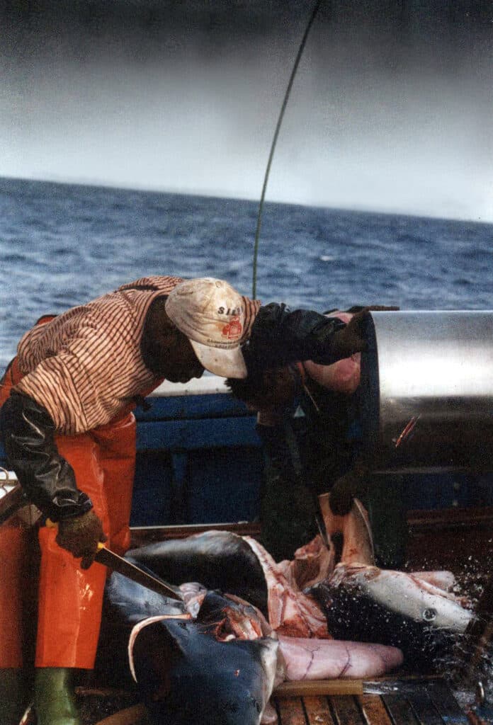 No parque de pesca, os homens matam e prepararam o peixe. O tubarão é «anestesiado» com umas pauladas na cabeça, cortam-lhe a cauda (que é perigosa), decepam-no. Depois, espetam-lhe uma vara de metal na espinha e retiram as alhetas. O resto é atirado borda fora. Mata-se um animal com meia tonelada ou mais para aproveitar 30 de quilos de alhetas…