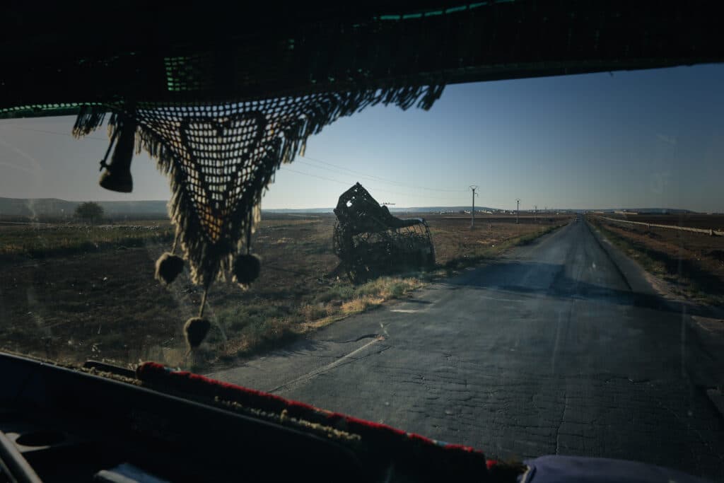 Passamos pela estrada da morte. Do lado direito do troço, bidons e autocarros amontoados protegem-nos dos atiradores furtivos. Antes de colocarem as protecções, só se circulava, aqui, a mais de 120 à hora…