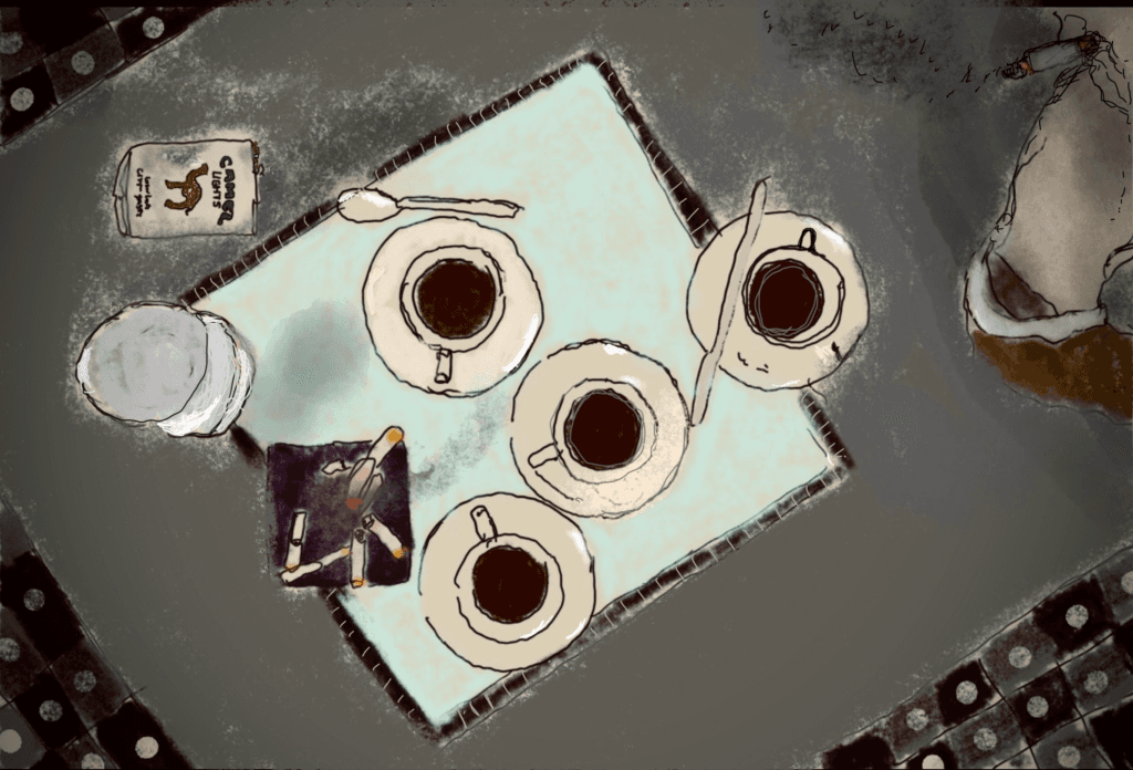 Sem termos combinado nada, apareceu o Tim, que vive ali perto e é frequentador assíduo do Tebas. Enquanto ele saboreava um pastel de nata, e a propósito da conversa que estávamos a ter sobre o poeticamente correcto, sugeriu que fôssemos visitar a fábrica da Negrita, ali ao virar da esquina, na Rua Maria Andrade. Ficou apenas cinco minutos, pois estava atrasado para o trabalho, como sempre, e escolheu tomar apenas o café funcional da manhã. A 80 cêntimos, ainda nos podemos dar ao luxo de satisfazer o vício. Fez-me lembrar a compilação das onze curtas metragens de Jim Jarmush que deram origem ao filme de 2003 Coffee and Cigarettes. Figuras como Tom Waits, Iggy Pop, Jack White e Roberto Benigni, entre outras, exploram uma ampla variedade de temas, enquanto desfrutam de cafés e cigarros.