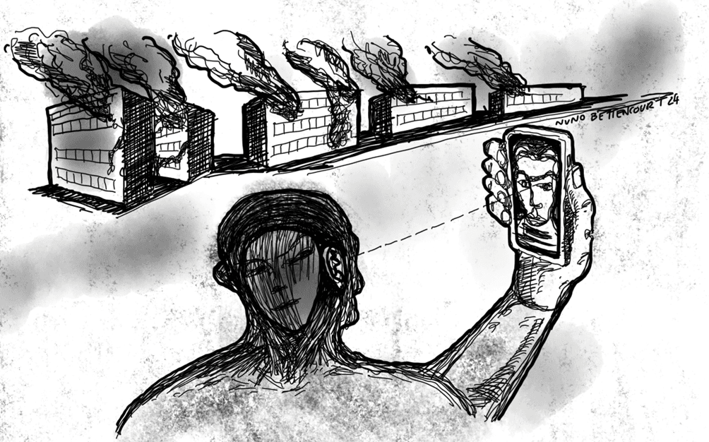 Tentei fazer uma foto novamente da minha cara, da qual me orgulhasse, e que não fosse mais uma corriqueira. A primeira selfie saiu logo mal, demasiada pose, a segunda desfocou demais, a terceira queimou, na quarta, eu por estar tão irritado com o falhanço das anteriores, tinha uma cara de chateado. Não estava a resultar de forma nenhuma. A única vantagem em relação à “ucraniana” era o fundo que realmente escolhi bem. Era branco e neutro. Sei que há apps no telemóvel que já põem o fundo que quisermos, mas não gosto de usar apps, a minha costela de direita conservadora está sempre a fazer soar o alarme.