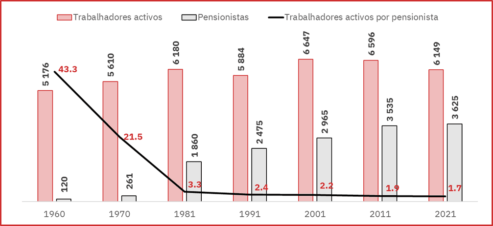 Como podemos observar na Figura 2, nos anos 60 tínhamos 43 trabalhadores activos por pensionista; hoje, temos 1,7 trabalhadores activos por pensionista. Tal significa que os jovens que entram hoje no mercado de trabalho têm de ganhar um salário si e para um pensionista!