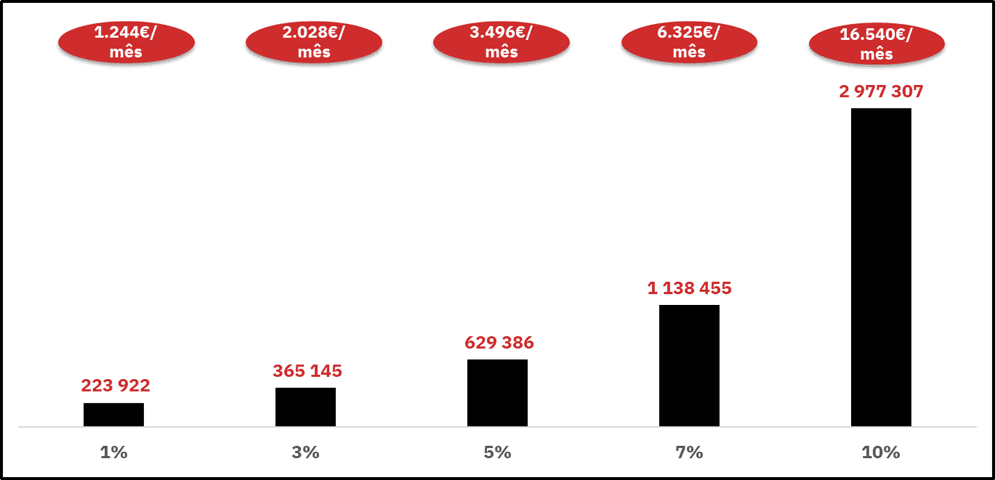 Se fosse aplicado a 1%, iria ter uma reforma de 1.244 euros/mês; se aplicasse a 10%, teria uma reforma de 16,5 mil euros por mês. Este último valor não é nenhuma impossibilidade, se tivermos em conta que o mercado norte-americano, em particular o índice S&P 500, gerou um retorno anual de 11% durante os últimos 50 anos, com uma inflação de 3,9% por ano para o mesmo período – um retorno real em torno de 7%. Por outro lado, se este “milionário” falecer aos 50 anos, alguém lhe devolve os “descontos”?