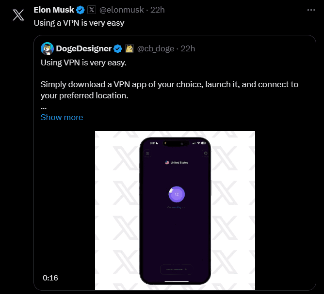 Contudo, sem mostrar qualquer recuo na sua decisão de enfrentar a política de censura no Brasil, Musk encorajou os utilizadores do X a recorrerem a redes privadas virtuais (VPN) para contornar a proibição que possa ser implementada. Num tweet publicado hoje com um vídeo explicativo de como se pode usar uma VPN, Musk escreveu: “Usar uma VPN é muito fácil”.