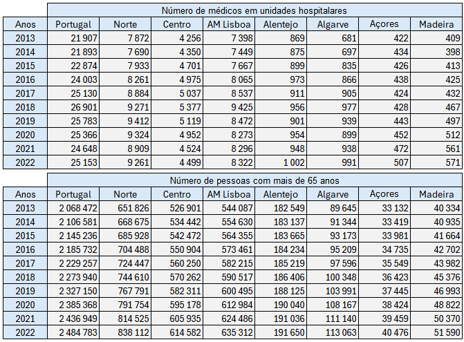 Caso se confronte, no período entre 2013 e 2022, a evolução da população com mais de 65 anos com a evolução do corpo clínico hospitalar, constata-se um evidente agravamento causado pelos anos de gestão pandémica. Se entre 2013 e 2019 o aumento relativo de médicos hospitalares (+17,7%) superava o crescimento relativo da população idosa (+12,5%), sendo assim um sinal bastante positivo, os anos subsequentes (2020, 2021 e 2022) inverteram completamente essa tendência. Assim, de acordo com os dados do INE, entre 2013 e 2022 – e por via do triénio da pandemia – só se registou um aumento de 3.246 médicos hospitalares (+14,8%) para, em certa medida, cuidar de um país que viu a população com mais de 65 anos aumentar 20,1%, tendo passado de 2,07 milhões de pessoas para cerca de 2,48 milhões, isto é, mais 416 mil idosos.