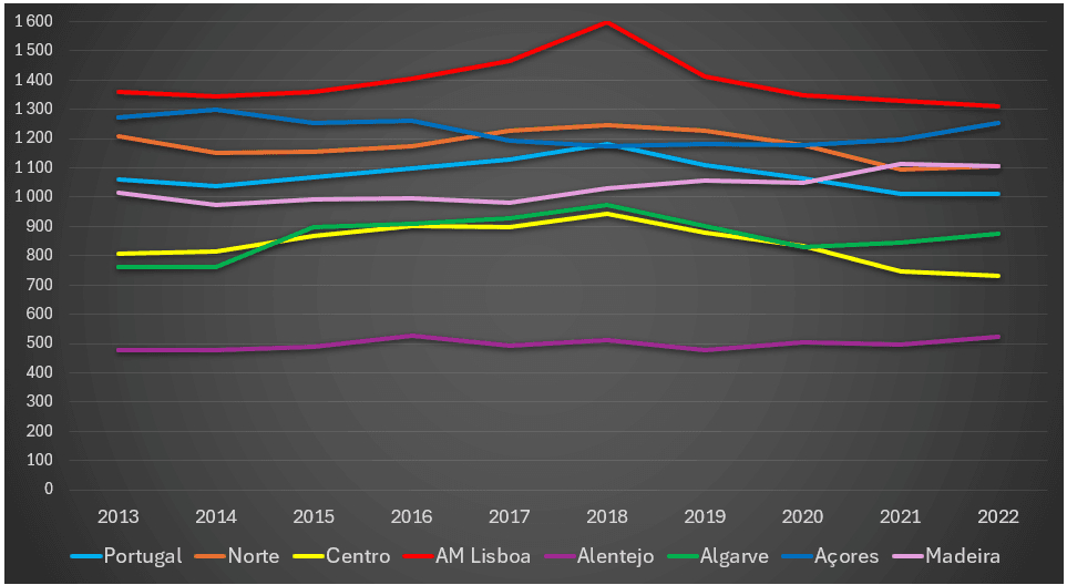 Nas duas regiões mais populosas – Área Metropolitana de Lisboa e Norte –, o agravamento da cobertura médica hospitalar é inferior, mas também evidente. No caso da região que engloba a capital, o rácio em 2022 situava-se em 1.310 médicos por 100 mil idosos, ligeiramente abaixo dos 1.360 registados em 2013, mas bastante abaixo dos 1.596 por 100 mil idosos em 2018, o que demonstra a fraca aposta em dotar os hospitais com uma realidade previsível: incremento da população potencialmente mais vulnerável. Na Área Metropolitana de Lisboa havia em 2022 mais 91 mil pessoas idosas do que em 2013 (+16,8%), mas somente mais 924 médicos.