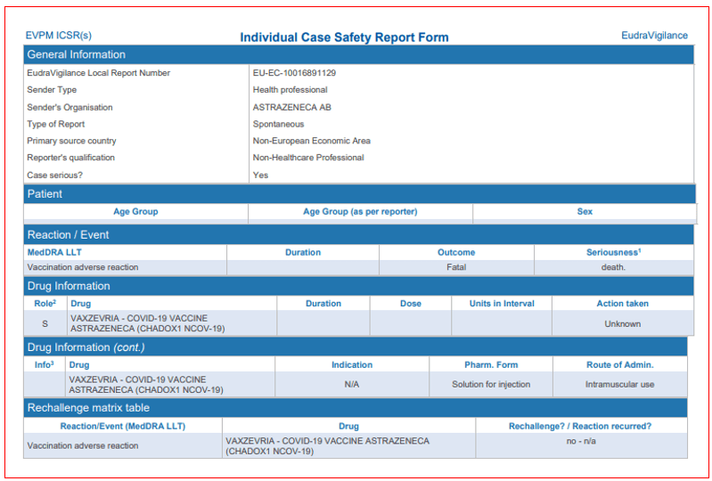 Em anos anteriores, desde a aprovação da vacina da AstraZeneca, somente se encontra a assumpção na base de dados da EMA de se estar perante casos mortais de reacção à vacina da AstraZeneca em quatro registos com desfechos fatais, dos quais três em 2021 e um em 2022. Este suposto agravamento dever-se-á sobretudo a razões de política de regulação, pois durante a pandemia tanto as farmacêuticas como os reguladores e autoridades políticas e de saúde pública procuraram minimizar a existência de efeitos adversos graves, buscando sempre destacar as vantagens da vacinação, mesmo em grupos etários pouco vulneráveis à covid-19, ‘instigados’ a serem inoculados.