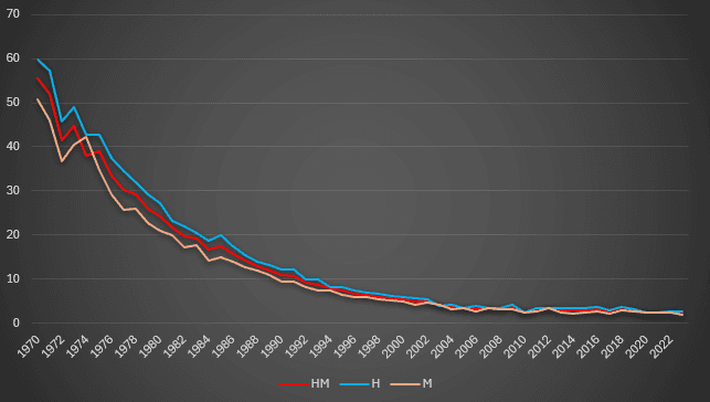 Apesar da situação favorável nas meninas, a taxa de mortalidade infantil global fixou-se em 2,45, ligeiramente acima do mínimo histórico de 2,43 observado em 2021. Essa situação deve-se também, em parte, ao facto de nascerem mais rapazes do que raparigas, geralmente numa proporção de 55/45. Ao longo de 2023 registaram-se, em termos absolutos, 215 óbitos de menores de um ano em Portugal. A maioria morreu nos primeiros 28 dias de vida – ou seja, mortalidade neonatal -, sendo que destes, 88 não sobreviveram para lá dos 7 dias após o nascimento. Em geral, são casos de malformações congénitas graves não detectadas durante a gestação ou já numa fase em que se se mostra legalmente impossível a interrupção da gravidez.