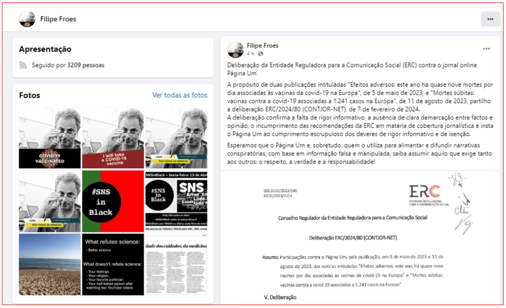 A Entidade Reguladora para a Comunicação Social (ERC) anulou a sua própria deliberação de Fevereiro passado contra o PÁGINA UM por causa da publicação de notícias sobre os efeitos adversos das vacinas contra a covid-19. Aquela deliberação, surgida de duas queixas, sob anonimato, do pneumologista Filipe Froes – um dos médicos portugueses com maiores relações comerciais com a indústria farmacêutica – acusava o jornal de “falta de rigor informativo, sobretudo pela insuficiência na demostração de um nexo de causalidade entre a toma das vacinas e as mortes e na ausência de fontes de informação diversificadas”. Saliente-se que Filipe Froes tem em curso um processo de averiguações em curso, ,as parado há meses, no Infarmed sobre as suas relações com as farmacêuticas.