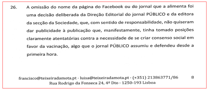 Com efeito, nessa peça jurídica assumida pelo Público, é escrito o seguinte sobre o artigo do PÁGINA UM que era de um rigor a toda a prova: “A omissão do nome da página do Facebook ou do jornal que a alimenta foi uma decisão deliberada da Direcção Editorial do jornal PÚBLICO e da editora da secção da Sociedade, que, com sentido de responsabilidade, não quiseram dar publicidade à publicação que, manifestamente, tinha tomado posições claramente atentatórias contra a necessidade de se criar consenso social em favor da vacinação, algo que o jornal PÚBLICO assumiu e defendeu desde a primeira hora.”