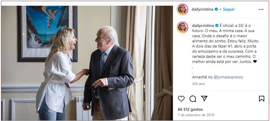 “É oficial: a SIC é o futuro. O meu. A minha casa. A sua casa. Onde o desafio é o maior alimento do sonho. Estou feliz. Muito. A dois dias de fazer 41, abro a porta do entusiasmo e da surpresa. Com a certeza deste ser o meu caminho. O melhor ainda está por ver. Juntos. ❤”. E o melhor veio para ambos os lados.