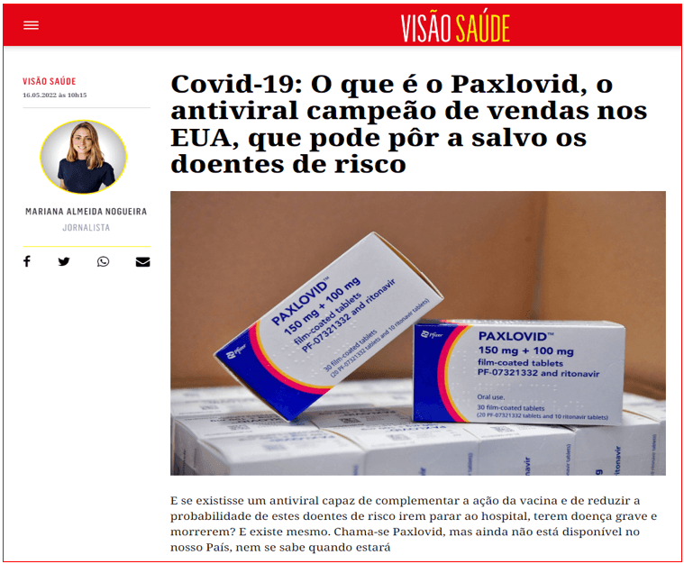 Nos primeiros meses de 2022, a imprensa portuguesa destacava um antiviral de administração oral contra a covid-19 produzido pela Pfizer, “campeã de vendas” nos Estados Unidos. A revista Visão, num artigo de Maio desse ano, questionava mesmo: “Perante a importância do Paxlovid, surge a dúvida: Por que razão não está ainda disponível no nosso País?”. Seguia-se a resposta do pneumologista Filipe Froes, um dos médicos com mais ligações comerciais às farmacêuticas, incluindo a Pfizer, que garantir que desde Janeiro daquele ano, a Direcção-Geral da Saúde estava a preparar uma norma “para a utilização o mais racional e equitativa possível deste medicamento”.