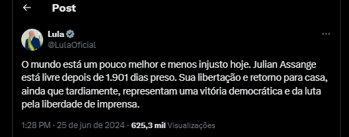 Várias figuras públicas e políticos celebraram a libertação de Assange, nomeadamente Lula da Silva, presidente do Brasil, que escreveu na rede X: “O mundo está um pouco melhor e menos injusto hoje. Julian Assange está livre depois de 1.901 dias preso. Sua libertação e retorno para casa, ainda que tardiamente, representam uma vitória democrática e da luta pela liberdade de imprensa”. Mas o presidente brasileiro foi de imediato criticado por permitir que estejam a ser perseguidos jornalistas no seu país.