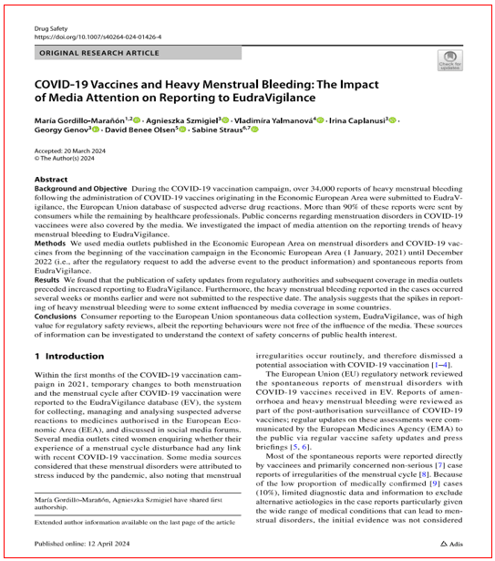 2 – Gordillo-Marañón, M., Szmigiel, A., Yalmanová, V. et al. COVID-19 Vaccines and Heavy Menstrual Bleeding: The Impact of Media Attention on Reporting to EudraVigilance. Drug Saf (2024). https://doi.org/10.1007/s40264-024-01426-4 (FICHEIRO 22)