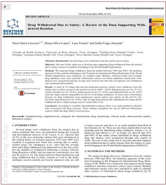 Neste artigo científico destacam-se os aspectos críticos da eficácia e seguranças dos fármacos, também do ponto de vista do impacte financeiros das farmacêuticas. E salienta-se que “relatos de casos individuais ou séries de casos, estudos observacionais, comparações aleatórias ou revisões sistemáticas podem levar à retirada pós-comercialização de um produto farmacêutico devido a mortes relacionadas ao medicamento. A retirada de produtos do mercado devido a mortes pode ser controversa, especialmente quando não existe uma ligação directa entre o consumo de fármacos e a morte”. Acrescenta-se ainda que “o desenvolvimento de medicamentos é um processo que leva de 12 a 15 anos, com muitas falhas e muita incerteza. Pode custar mais de US$ 1 mil milhão desde o conceito inicial até o lançamento de um produto acabado”, salientando-se que “como apenas cerca de 1.500 pessoas são expostas a um produto farmacêutico antes de ele ser comercializado, nada se sabe sobre a sua segurança no uso clínico. Como às vezes é necessário julgamento clínico para detecção e diagnóstico, uma avaliação de segurança de medicamentos deve ser considerada parte integrante da prática clínica diária”.