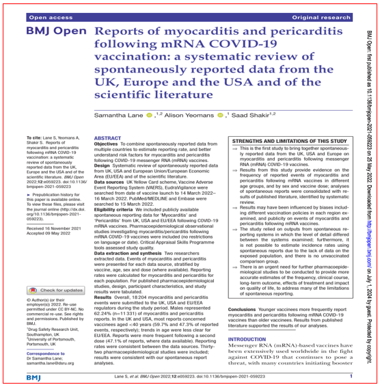 5 – Lane S, Yeomans A, Shakir S. Reports of myocarditis and pericarditis following mRNA COVID-19 vaccination: a systematic review of spontaneously reported data from the UK, Europe and the USA and of the scientific literature. BMJ Open 2022;12:e059223. doi: 10.1136/bmjopen-2021-059223 (FICHEIRO 32)