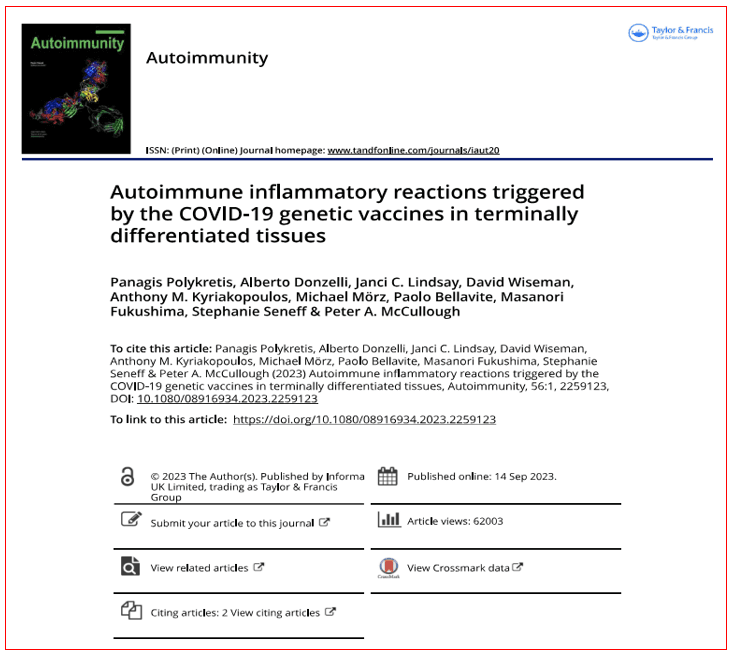 10 – Polykretis, P., Donzelli, A., Lindsay, J. C., Wiseman, D., Kyriakopoulos, A. M., Mörz, M., … McCullough, P. A. (2023). Autoimmune inflammatory reactions triggered by the COVID-19 genetic vaccines in terminally differentiated tissues. Autoimmunity, 56(1). https://doi.org/10.1080/08916934.2023.2259123 (FICHEIRO 37)