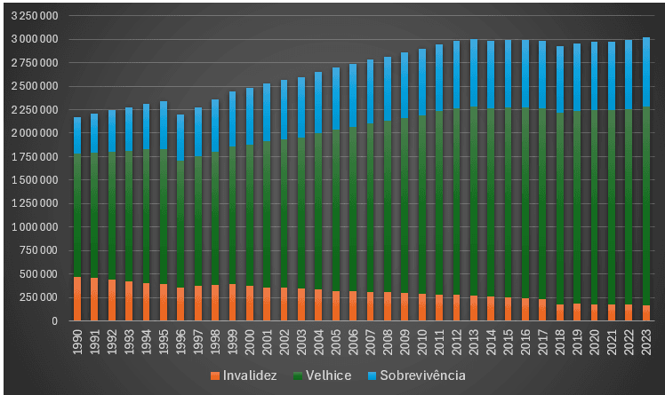De entre a tipologia das pensões, 70% (2.117.487) são por velhice, sendo este o valor mais elevado de sempre, por via do aumento da expectativa de vida dos mais idosos nas últimas décadas, mesmo com a pandemia. O número de pensões de velhice diminui em 318 entre 2020 e 2021, mas no ano de 2022 já subira 11.726. Em 2023, o aumento ainda foi mais substancial: mais 35.692 pensionistas, o maior crescimento desde o momento em que a idade da reforma passou a estar indexada à expectativa de vida.