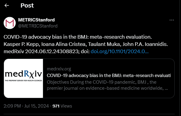 Num artigo de avaliação de meta-pesquisa, ainda em fase de peer-reviews, mas já divulgado ontem por um centro de investigação (METRIS) da Universidade de Stanford, Ioannidis e mais três investigadores, um dos quais da Universidade italiana de Pádua, destacam sobretudo o enviesamento criado pela avaliação dos lobbies científicos, com destaque para os membros ad hoc do Independent Sage (indie_SAGE). Este grupo de cientistas sobretudo do Reino Unido, alegadamente independentes, encabeçados por Anthony Costello e Stephen Griffin, tiveram uma acção preponderante em medidas mais restritivas da gestão da pandemia e mesmo na vacinação de crianças.