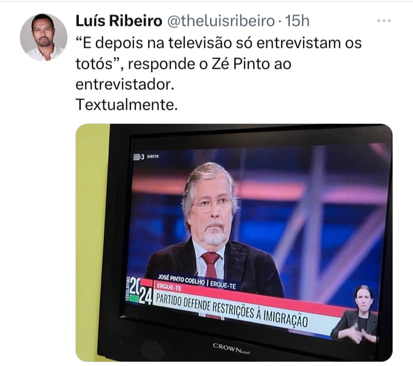 Aquilo serve para, como nas feiras, se mandar uns tirinhos nos bonecos. Sobretudo se se é jornalista. E sobretudo se se é um jornalista do quilate do Luís Ribeiro, que já foi apontado pela Entidade Reguladora para a Comunicação Social de ser um ‘jornalista comercial’ por fazer trabalhos de prestação de serviços a empresas externas (parceiros) numa revista (Visão) que integra uma empresa unipessoal de 10 mil euros que tem 10 milhões de euros de dívida ao Estado. Divertiu-se muito ontem, o Ribeiro, em enxurrada de bocas no X. Hoje, divirto-me.