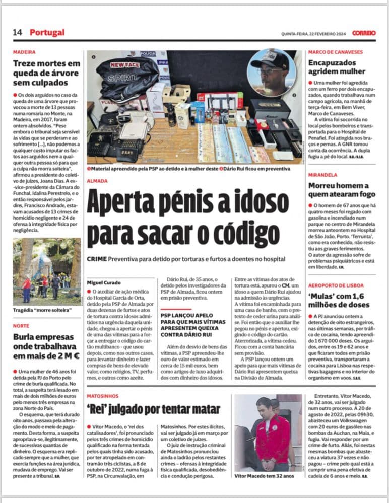 Por exemplo, imaginem se o tal auxiliar do Hospital Garcia de Orta tivesse apertado os testículos a um idoso para lhe “sacar o código do cartão multibanco”, e comprar depois “bens de elevado valor, como relógios, TV, perfumes, e outros como azeite”. Não cabia. Por sorte, apertou-lhe o pénis, que tem apenas cinco letrinhas, fica pela metade. Cabe na perfeição no desenho da página. Concluindo, apertar um pénis em vez dos testículos é não apenas menos doloroso como muito mais cómodo para a difícil arte de titular um jornal. É um dois em um.