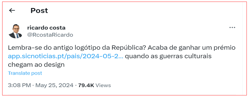 Por esse motivo, compreende-se que Ricardo Costa tenha vindo a correr dar uma alfinetada no Governo Montenegro por ter eliminado um rectângulo verde, um círculo amarelo e um quadrado vermelho como logótipo da Nação, uma vez que a ‘obra’ acabou de ganhar um prémio de design.