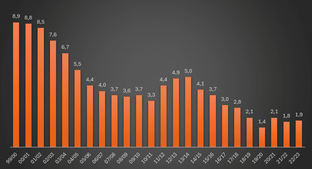 Em termos absolutos, no ano lectivo de 2012/2013 frequentaram o ensino básico quase 1,2 milhões de alunos, pelo que, com essa taxa de retenção (10,4%), terão chumbado cerca de 120 mil alunos, sendo que cerca de 69 mil estavam no 3º ciclo. Se considerarmos as taxas de retenção de 2019/2020, também por força da redução da população jovem, de entre os 970 mil alunos do ensino básico nesse ano houve pouco mais de 19 mil ‘chumbos’, sendo que quase 11 mil frequentavam o 3º ciclo.