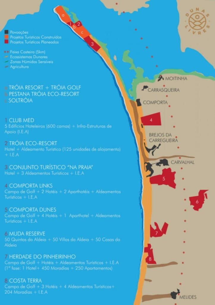 A esperança parece desvanecer-se para a Associação, que vai vendo as gruas e os avanços dos muitos projectos na zona, alguns classificados como Projecto de Interesse Nacional (PIN), a nascer em cimas das dunas ou ao lado de outros habitats ricos e únicos. (Recorde-se que o Ministério Público suspeitou que o antigo ministro da Economia, Manuel Pinho, favoreceu o Grupo Espírito Santo na classificação da Herdade da Comporta e da Herdade do Pinheirinho como PIN). Mas, ouvindo Rebeca Mateus, percebe-se que a Dunas Livres está muito longe de desistir de combater os avanços dos empreendimentos de luxo.