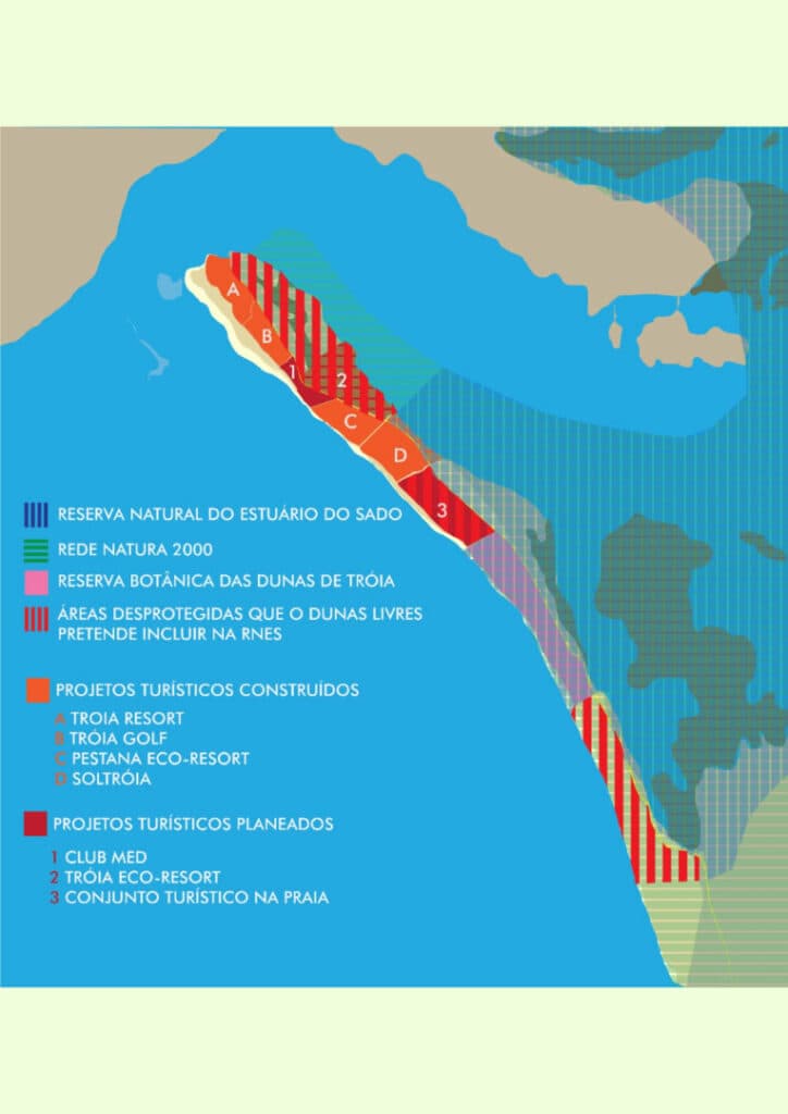 Além de sensibilizar para a necessidade de proteger aquela zona costeira da agressiva construção de empreendimentos de luxo e casas para os ricos e os muito ricos, através das redes sociais e dos media, a Associação Dunas Livres tem promovido acções de protesto e mobilizado a população a actuar em consultas públicas e petições. Mas também avançou para a Justiça para pedir acesso a informação a avançar com um procedimento cautelar. (Aliás, a Dunas Livres tem tido como advogado Rui Amores, que é também advogado do PÁGINA UM nas muitas acções que o jornal tem tido na Justiça, graças ao Fundo Jurídico do jornal).