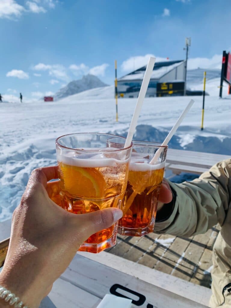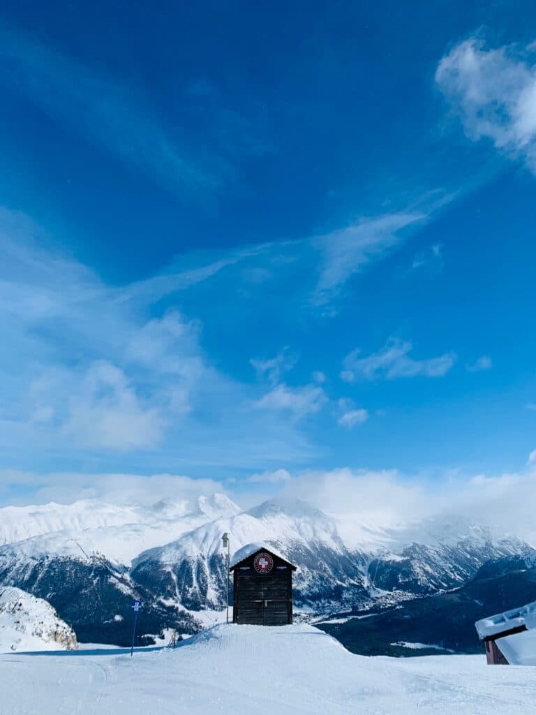 Depois de duas horas e meia de cenários de cortar a respiração chegamos à sofisticadíssima Saint Moritz. Saindo da estação seguimos a pé até ao teleférico, que nos levou ao pico da montanha mais alta, almoçámos literalmente entre as nuvens.