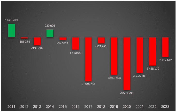 Mas esses 11,4 milhões de euros são apenas uma parte dos resultados financeiros da SCMP. Segundo a análise do PÁGINA UM, nos últimos cinco anos a Misericórdia do Porto perdeu, em todas as suas actividades, quase 21,5 milhões de euros. E desde 2014 não sabe o que é ter contas positivas. É certo que os dois primeiros anos da pandemia (2020 e 2021) foram francamente maus, sobretudo por causa da decisão governamental de ‘abrandar’ as actividades hospitalares não-covid, contribuindo para prejuízos de quase sete milhões de euros só na actividade hospitalar. Porém, os problemas financeiros provêm de um período anterior.