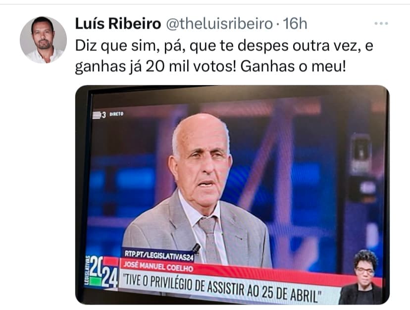 Aquilo serve para, como nas feiras, se mandar uns tirinhos nos bonecos. Sobretudo se se é jornalista. E sobretudo se se é um jornalista do quilate do Luís Ribeiro, que já foi apontado pela Entidade Reguladora para a Comunicação Social de ser um ‘jornalista comercial’ por fazer trabalhos de prestação de serviços a empresas externas (parceiros) numa revista (Visão) que integra uma empresa unipessoal de 10 mil euros que tem 10 milhões de euros de dívida ao Estado. Divertiu-se muito ontem, o Ribeiro, em enxurrada de bocas no X. Hoje, divirto-me.