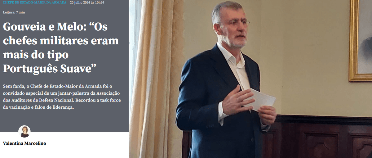 Enfim, certo é que na leitura, em menos de sete minutos, o leitor cruza-se com encantatórias palavras, sempre meigas, sempre elogiosas, sentindo-se sempre um aroma a maresia, um sabor a grandeza. No início vai logo à espinha, para logo seguir para o coração: “Descontraído, comunicativo e até com umas tiradas de humor, o almirante Gouveia e Melo escolheu o tema da liderança para falar a uma plateia de auditores de Defesa Nacional, militares e deputados, convidados de um jantar-palestra realizado no Clube Militar Naval, em Lisboa, na última quinta-feira.” Prossegue, e logo citando as palavras, sempre modestas, sempre humildes, de um Grande Líder, que menos do que Grande Almirante não poderia ser: “Um chefe militar tem de ter coragem. Ser honesto com o poder político e, quando necessário, vir a público dar a cara. É isso que faço. Se calhar, os chefes militares eram mais do tipo Português Suave, mas eu sou de um género nada suave”.