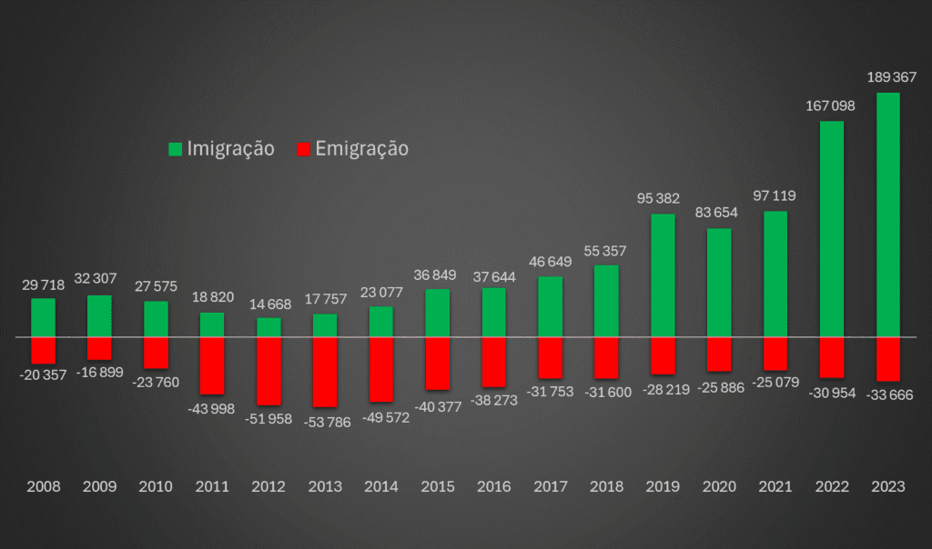 No ano de 2022 ultrapassou-se pela primeira vez desde 1975 a fasquia dos 100 mil para o saldo migratório, fruto da entrada de 167.098 imigrantes e da saída de 30.954 emigrantes. Por fim, no ano passado, o saldo migratório chegou aos 155.701, por via de uma entrada de perto de 190 mil emigrantes e da saída de 33.666 pessoas para o estrangeiro. Note-se que a emigração de 2023 constitui o valor mais elevado desde 2016, embora a proporção se tenha modificado bastante. Se em 2017 por cada 100 pessoas que emigravam para o estrangeiro se contabilizavam 147 entradas de emigrantes, no ano passado esse rácio subiu para 562.