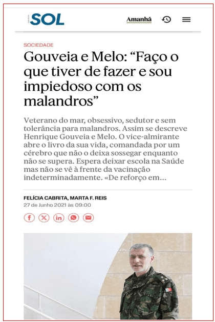 A postura messiânica de Gouveia e Melo, auto-alimentada – e que teve o seu ‘momento Mário Soares‘ em Odivelas, numa versão soft, no decurso de uma estúpida e contraproducente manifestação contra a vacinação das crianças (não pelo sentido, mas porque assim o transformaram num mártir) – mostra-se bem patente numa entrevista em Junho de 2021 ao jornal Sol. É aqui que o agora putativo candidato a Belém melhor se dá a conhecer, e também onde consegue revelar o pior que tem, que é muito para o pouco que dá.