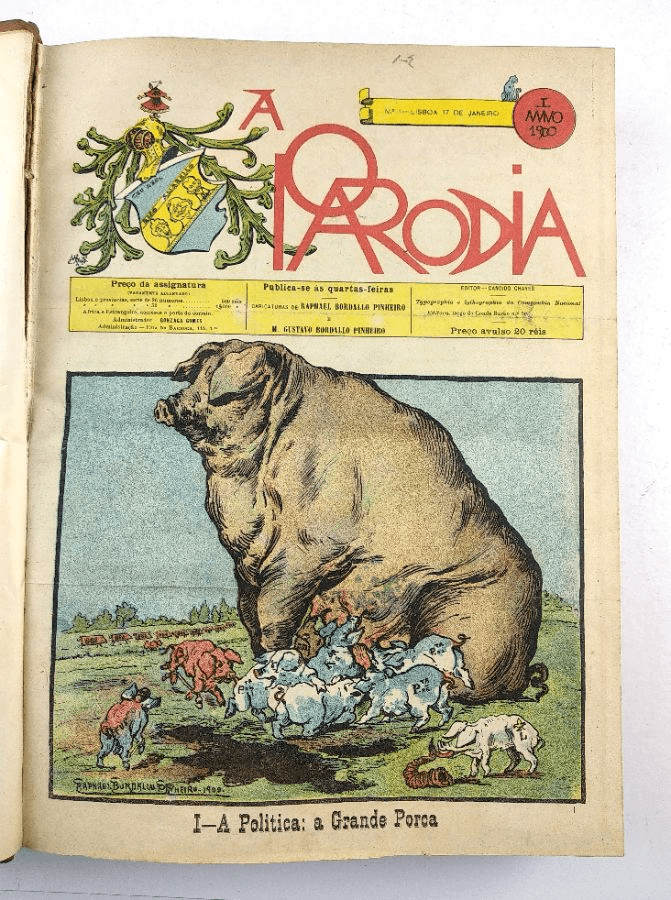 Depois de A Lanterna Mágica (1875), o António Maria (1879-1898) e Os Pontos dos is (1885-1891), A Paródia era um semanário de referência que, sob a direção de Bordalo, fazia as delícias dos burgueses e o temor dos políticos que se viam retratados nas caricaturas sem grande piedade. O periódico inspirava-se nos jornais satíricos que estavam em voga por essa Europa fora, como o inglês Punch ou o francês Charivari. Todavia, deve-se dizer que em nada ficava atrás daqueles dois famosos jornais. O nosso A Paródia era tão bom como os melhores de lá de fora… E só para se ter uma ideia da sua qualidade e atualidade basta passar os olhos pela primeira página do primeiro número (17 de janeiro de 1900), no qual a política era representada por… uma grande porca.