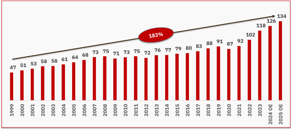 Em 2025, preparam-se para nos arrancar mais oito mil milhões de euros — porque, claro, o roubo é sempre para mais, nunca para menos. Esta será a terceira maior subida, perdendo apenas para 2023 (um espectacular aumento de 15,4 mil milhões de euros e para 2022 (mais 10,4 mil milhões de euros) — graças à inflação patrocinada pelo BCE e à pandemia inventada.