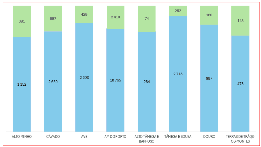 Com efeito, na região Norte, nenhuma das sub-regiões ultrapassa os 25% de bebés nascidos de mães ‘estrangeiras’, sendo esta percentagem particularmente baixa no Tâmega e Sousa (7,1%) e no Ave (13,7%). No entanto, como acima referido, destacam-se os valores elevados de Monção e Valença, devido à vizinhança com a Galiza. Estes valores heterogéneos reforçam o perfil mais homogéneo destas áreas, onde predominam mães de naturalidade portuguesa. Outras sub-regiões do Norte, como o Cávado (20,6%) e a Área Metropolitana do Porto (18,3%), situam-se ligeiramente acima dos valores mais baixos da região, mas ainda distantes de outras partes do país com maior diversidade.