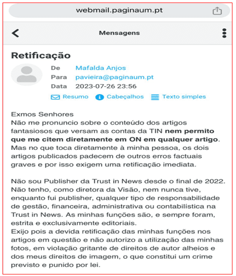 Mafalda Anjos fez, em Julho do ano passado, um exercício de indignação quando o PÁGINA UM abordou as dívidas colossais que a Trust in News foi acumulando desde 2018. Mafalda Anjos na sua prepotência escreveu que: “não me pronuncio sobre o conteúdo de artigos fantasiosos que versam as contas da TI nem permito que me citem em ON em qualquer artigo”.