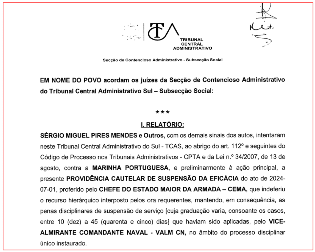 Com efeito, o acto considerado nulo pela TCAS não é um processo que “diz respeito ao castigo aplicado pelo Comandante Naval”. Aquilo que foi considerado nulo foi, objectiva e juridicamente, o acto de 1 de Julho de 2024. citado logo na primeira página do acórdão, “proferido pelo CHEFE DO ESTADO MAIOR DA ARMADA – CEMA, que indeferiu o recurso hierárquico interposto” pelos militares. Ou seja, o acto de Gouveia e Melo.