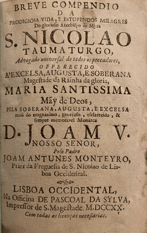 Ou seja, o prior da alfacinha paróquia de São Nicolau – no centro da Baixa, que foi freguesia até 2013, estando agora integrada na de Santa Maria Maior – era um dos conselheiros predilecto do Magnânimo, não apenas espiritual, mas também em negócios de Estado. Por exemplo, chegou a desempenhar funções de gestão em algumas fases da construção do Aqueduto das Águas Livres. A sua influência no Terreiro do Paço foi tanta que não admira que a dita biografia do nosso Pai Natal – pomposamente intitulada Breve compêndio da prodigiosa vida e estupendos milagres do glorioso Arcebispo de Myra S. Nicolao Taumaturgo, advogado universal de todos os peccadores – tivesse sido oferecida à Virgem Maria pela soberana, augusta e excelsa mão do magnânimo, generoso, esclarecido e sempre memorável monarca D. João V Nosso Senhor”, conforme consta no frontispício. Portanto, estamos perante uma obra escrita para ser levada a sério. Na verdade, muito a sério – naquela época, claro.