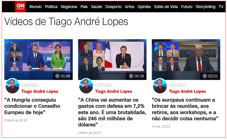 De facto, Tiago André Lopes, um habitual comentador de política internacional na CNN Portugal, esteve ontem à tarde a comentar o Conselho Europeu Extraordinário numa emissão com alguns percalços devido a dificuldades de comunicação, que se iniciou às 14h23. O comentário em concreto, cujo trecho foi gravado por um aluno, decorreu entre as 14h25 e as 14h33, ou seja, durante nove minutos. ↓