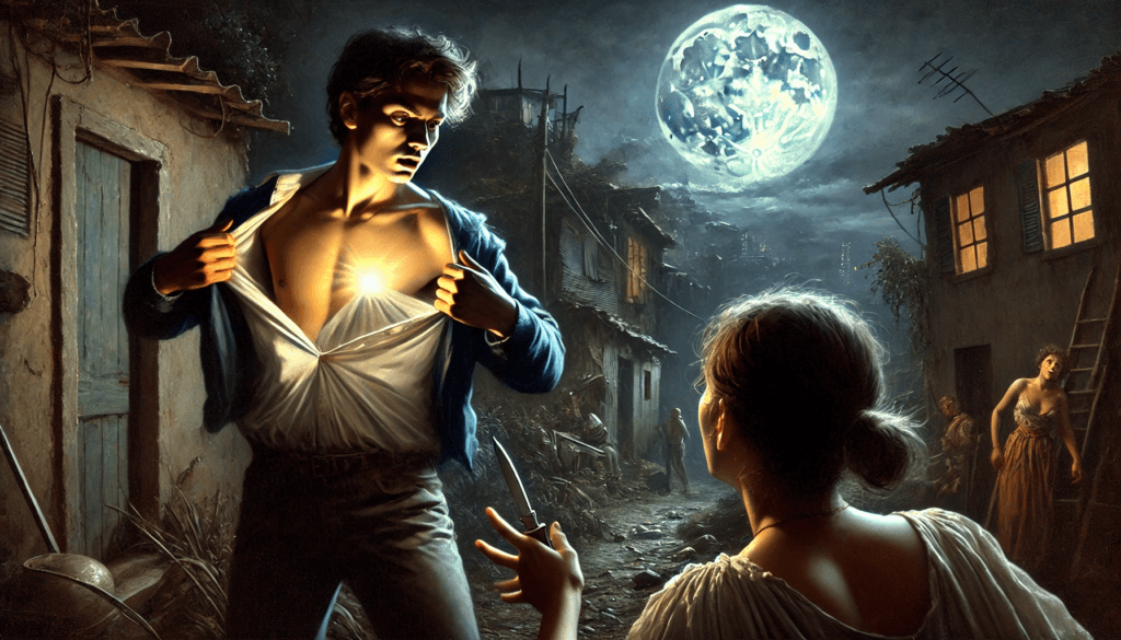 Aí, o Magro deu um jeito de corpo e se livrou da camisa. A lua batia bem nele. Ele estava com uma faixa de pano enrolada no peito.