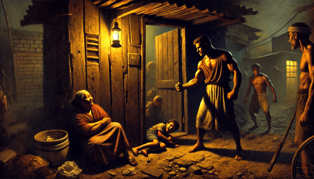 O Negãozinho bateu na porta do barraco. Quando a mãe da Marianita abriu a porta, de vela na mão, o Negãozinho mandou um soco nos queixos da mulher. Entrou no barraco, pegou a Marianita assim, na gravata, e se veio. Um dos guris correu de atrás, o menorzinho. O Negãozinho deu-lhe um pontapé que o coitadinho levantou no ar e depois caiu deitado.