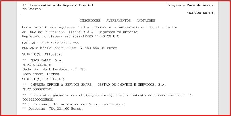 Os detalhes do negócio não foram divulgados publicamente, mas o valor da hipoteca foi de 19.607.540,03 euros de capital – ou seja, bem abaixo dos 24,2 milhões de euros da transacção de 2018. No registo surge ainda que o Novo Banco garantiu um financiamento máximo de até 27.450.556,04 euros, o que pode indiciar que houve outros compromissos assumidos entre as duas partes. Mas, apesar de ter ‘recuperado’ a posse efectiva da sede, a Impresa submeteu-se à taxa de juro anual aplicada ao empréstimo de 9%, a que acresce 3% de juros de mora em caso de atraso no pagamento de mensalidades.